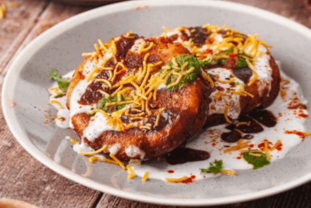 Potato patties stuffed with lentils, topped with yogurt, Tamarind and mint sauce.
