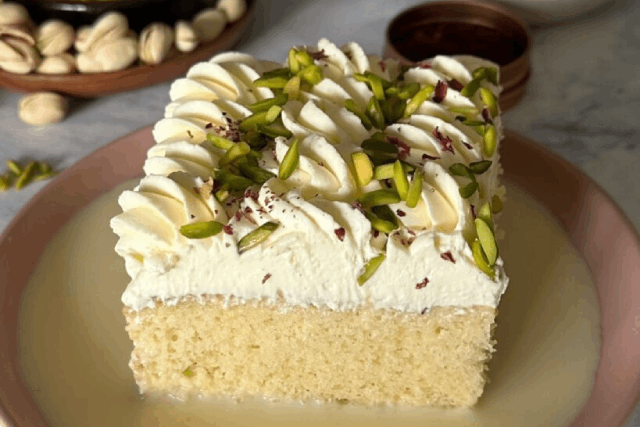 Soft, spongy cake soaked in three kinds of milk, infused with rasmalai flavors, and topped with nuts.