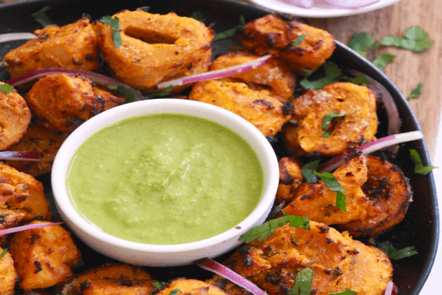 Grilled, marinated soya chaap, infused with aromatic spices, smoky flavor, and rich tandoori essence.